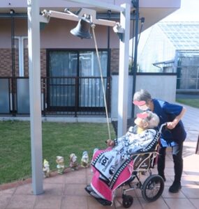 中庭の鐘を鳴らすと、やさしい音が広がって、みんなの笑顔もさらに輝きます🔔✨