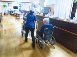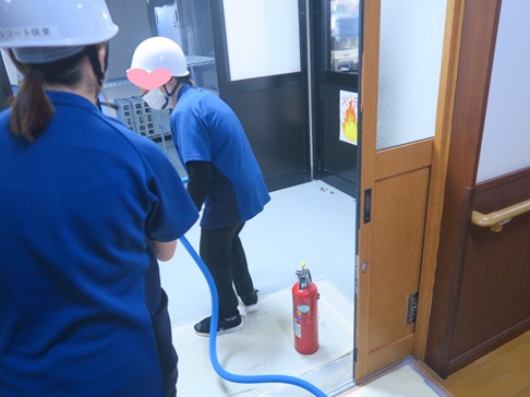 入居者様にはお部屋から非常口まで落ち着いて避難していただき、初期消火の訓練も実施。夜間は職員の人数が限られるため、迅速な応援体制の重要性も再確認しました。