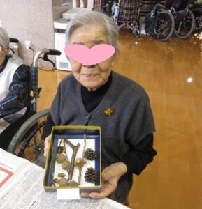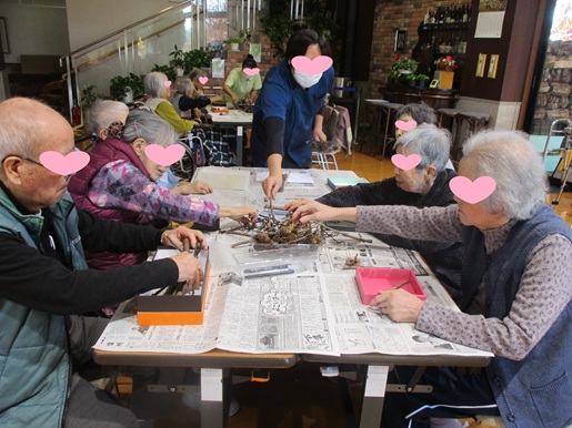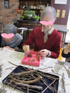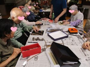 入居者の皆さまと一緒に「箱庭づくり」を楽しみました。 箱庭とは、浅い箱の中に庭園や風景を模して表現するもの。