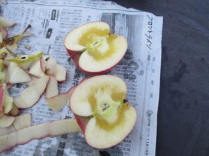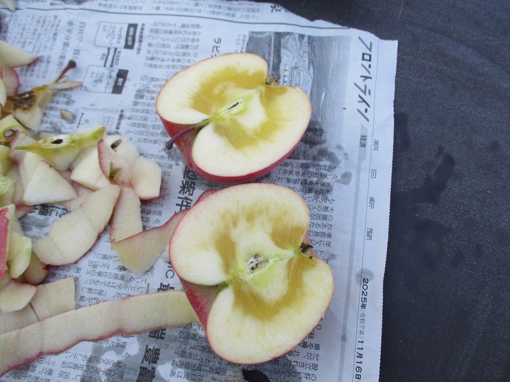 「どのりんごが蜜入りかな?」 農家さんのヒントは…赤くて、お尻が黄色いりんご! 入居者様と一緒に目を凝らして探す時間も楽しくて、見つけた瞬間は拍手が起こりました👏