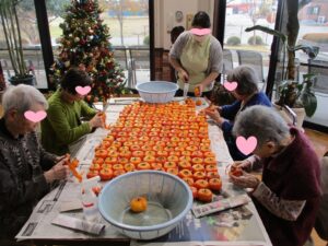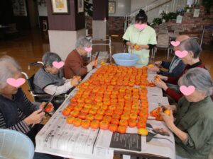 咲楽では例年行っていて1000個を超える年もあるほど! 入居者様と一緒に皮をむき、紐に吊るして並べる光景は、まさに秋の風物詩です。
