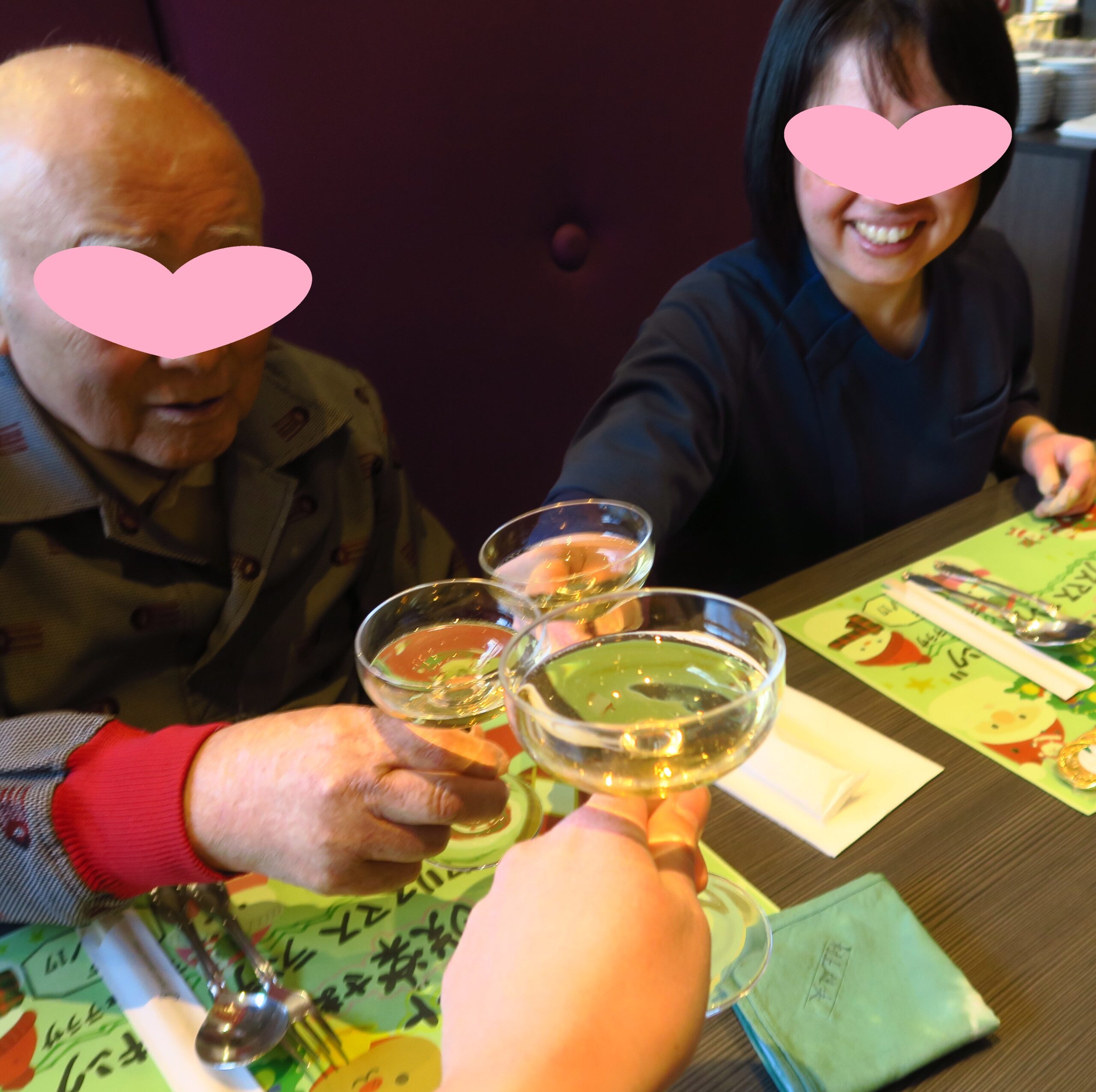 手作りのランチョンマットに感激! ノンアルコールスパークリングワインで乾杯し、色とりどりのお料理を心ゆくまで堪能。