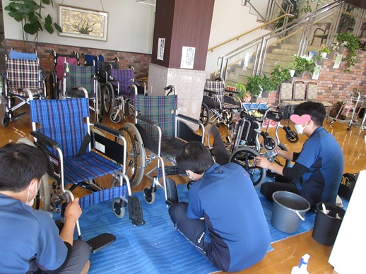 エールコート咲楽では、毎月車椅子や歩行器の点検・清掃を行っています。 ブレーキの効き具合、タイヤの空気圧、車輪の動きなどをしっかり確認し、 ご利用者様が毎日安心して過ごせるよう、心を込めて整備しています。