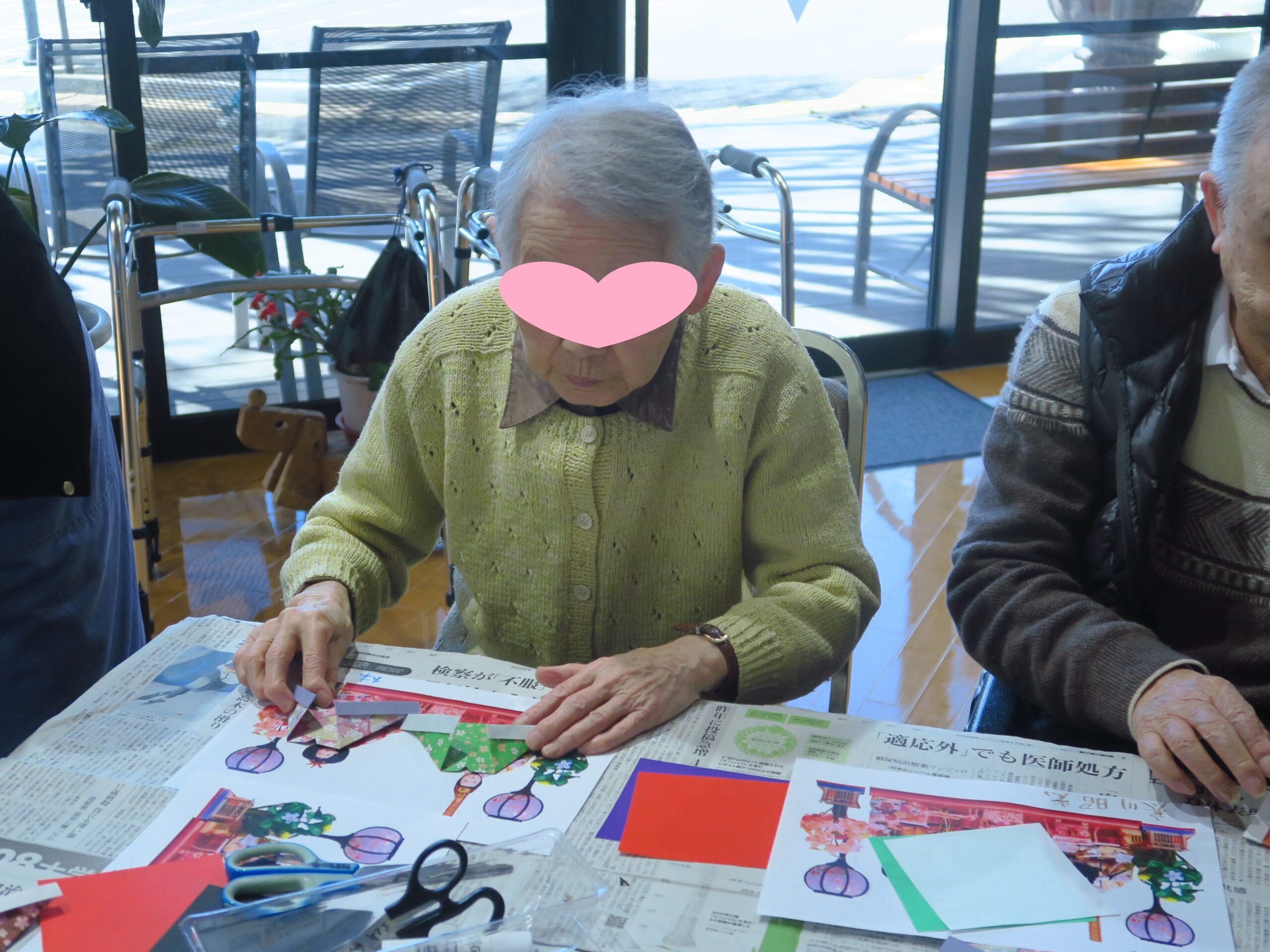 「どっちの向きに折るの?」「おびなは肩幅が広い方が立派よね」と、自然と会話もはずみます😊 少し難しい工程もありましたが、皆さん真剣な表情で取り組まれ、完成した作品に思わず笑顔がこぼれました。