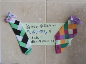 細くカットした色とりどりの画用紙を、丁寧に編み込んで… 世界にひとつだけの、オリジナルしおりが完成しました😊