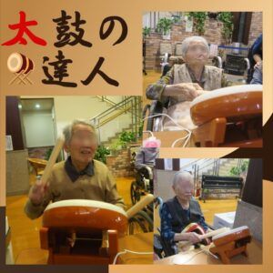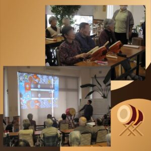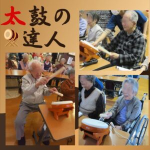 ボランティア様による本物の和太鼓演奏が控えていることもあり、その前に皆さん自身も“和太鼓気分”を味わおうと企画したレクリエーションです。